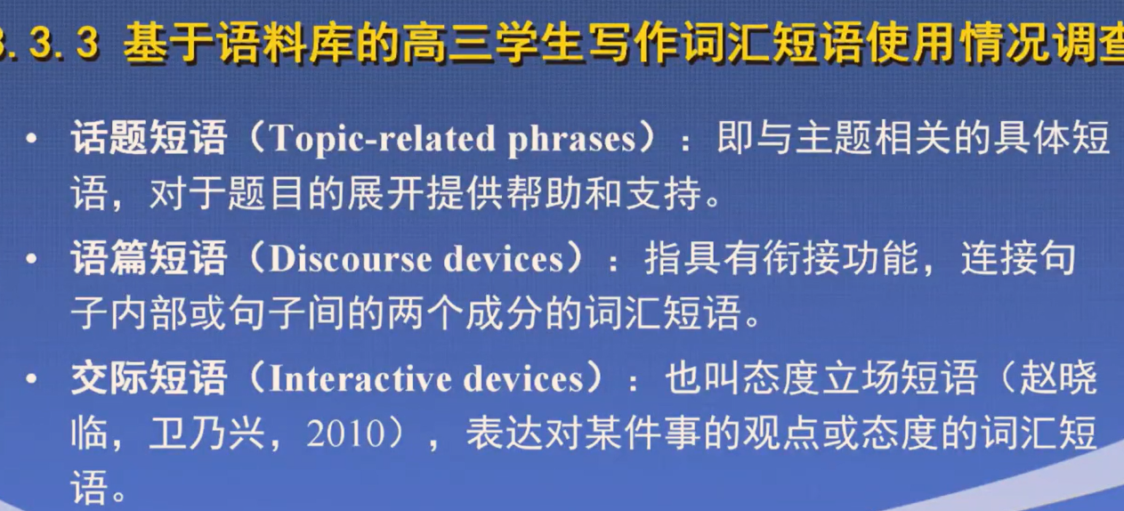 7.词汇短语教学启示及后续研究:挖掘教材板块资源,进行话题短语的提取和运用,整合模块教材资源,进行语篇短语和交际短语的提取和运用。后续研究:对本族语者书面语中词汇短语的使用情况进行对比分析